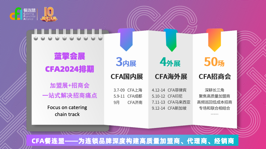 CFA:定位中国餐饮开年第一展,每年3月从上海出发,布局全国市场。作为中国餐饮连锁风向标、上海蕞大加盟展、中国餐饮投资加盟首选平台。“CFA餐连盟”聚焦餐饮各赛道众多头部品牌、知名品牌、热门品牌及广大餐饮投资人的热切目光,无疑成为各大展商首选的品牌发布、招商加盟、渠道代理、合作联营的交互平台。