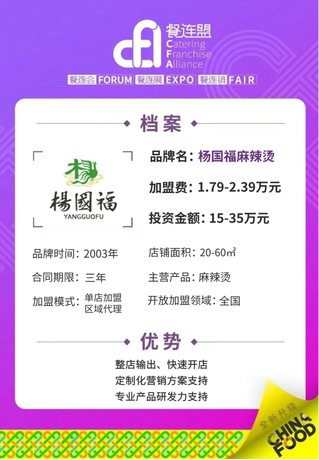 品牌简介杨国福集团是立足于本土、面向世界的快餐行业领导者。集团起源于2003年,其拥有家喻户晓的“杨国福”麻辣烫品牌,主营业务包括