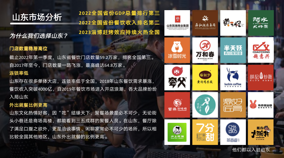 山东存在很多单体大店,连锁率普遍低于全国,2018年山东餐饮需求暴涨,餐饮收入突破4000亿,2019年山东餐饮总量力压广东,实现全国第一。然3年疫情的巨大影响,外加3年一周期的品牌迭代,大量品牌退出市场,各地门店出现巨大真空。随着疫情阴霾散去,大批新兴品牌及全国各地头部品牌纷纷布局山东、快速抢滩山东,涌现出一批高质量的品牌商和高质量的投资加盟商。现山东各大商场、夜市已清晰可见。
