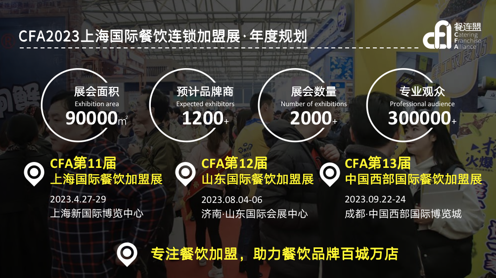 [温馨提示] 文章来源于CFA上海餐饮加盟展公众号,转载注明原文出处,此文观点与查生意无关,理性阅读,版权属于原作者若无意侵犯媒体或个人知识产权,请联系我们,本站将在第一时间删掉 ,查生意仅提供信息存储空间服务。