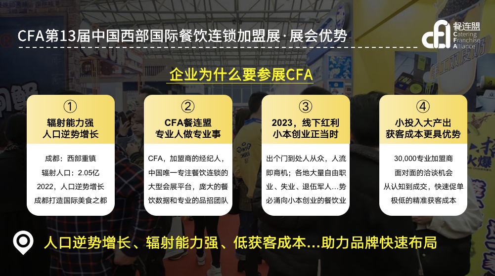 CFA:专注餐饮招商,因为专注、所以专业,应广大品牌之需求,CFA布局西部市场,助力品牌千城万店。CFA:加盟商的经纪人,以品质招商为核心,将组织四川、重庆、贵州、云南、陕西、甘肃、青海及新疆西藏区域的高质量投资加盟商群体,对接全国优秀的餐饮连锁品牌。
