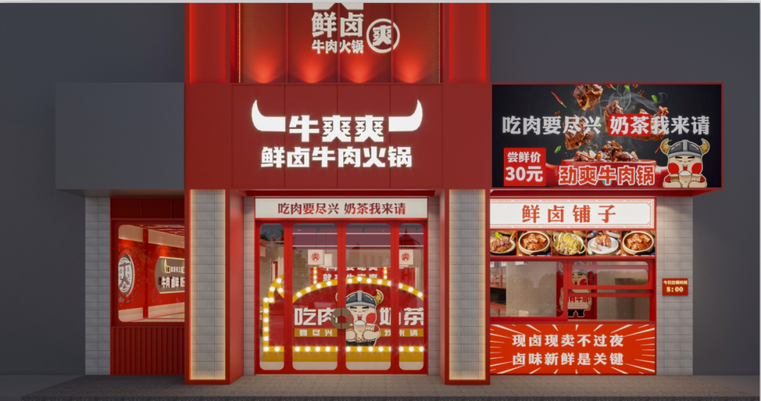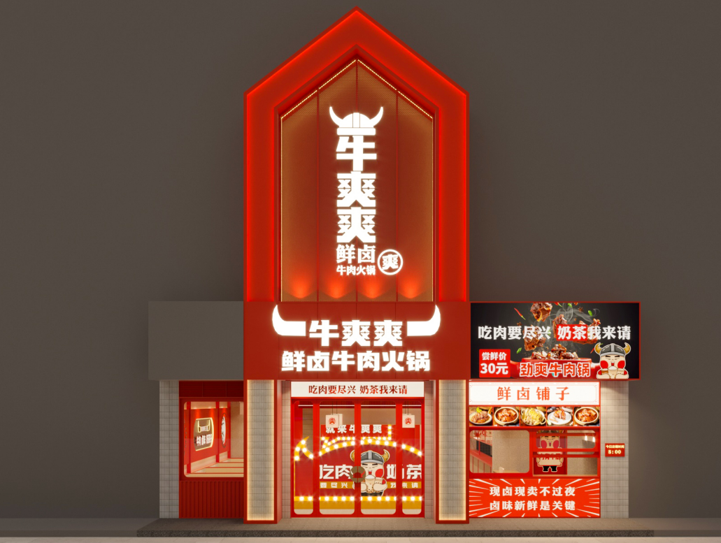 牛爽爽,以“热卤+牛肉火锅”为其特色,选择易于标准化的川渝口味,瞄准下沉市场的20岁~35岁用户群体,专注于打磨100~200平的社区火锅店模型。