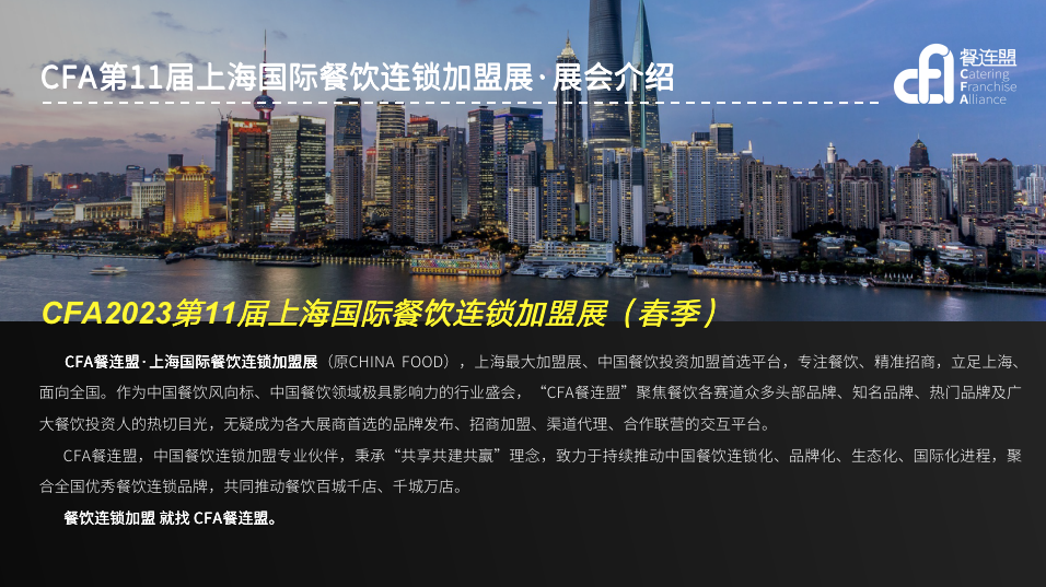 [温馨提示] 文章来源于CFA上海餐饮加盟展公众号,转载注明原文出处,此文观点与查生意无关,理性阅读,版权属于原作者若无意侵犯媒体或个人知识产权,请联系我们,本站将在第一时间删掉 ,查生意仅提供信息存储空间服务。