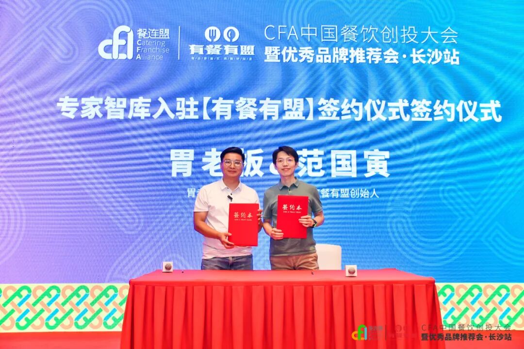 期间,CFA餐连盟创始人范国寅先生、抖音餐饮KOL 胃老板、苏州集造科技创始人杨华生先生达成战略合作,围绕“专家智库入驻有餐有盟”,举办了隆重的签约仪式。