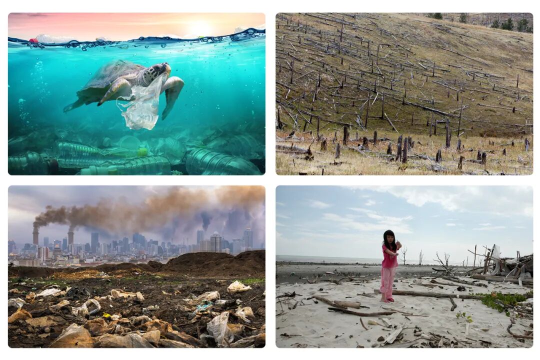 困顿在塑料之间的海龟、被砍伐殆尽的山林、严重污染的城市边缘、在贫瘠灰白的环境中玩耍的孩子……