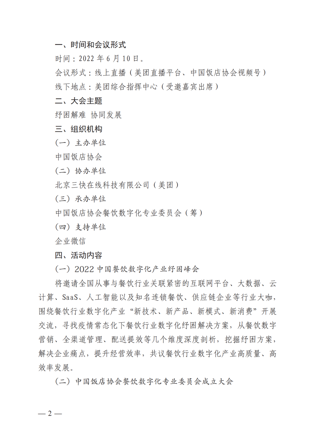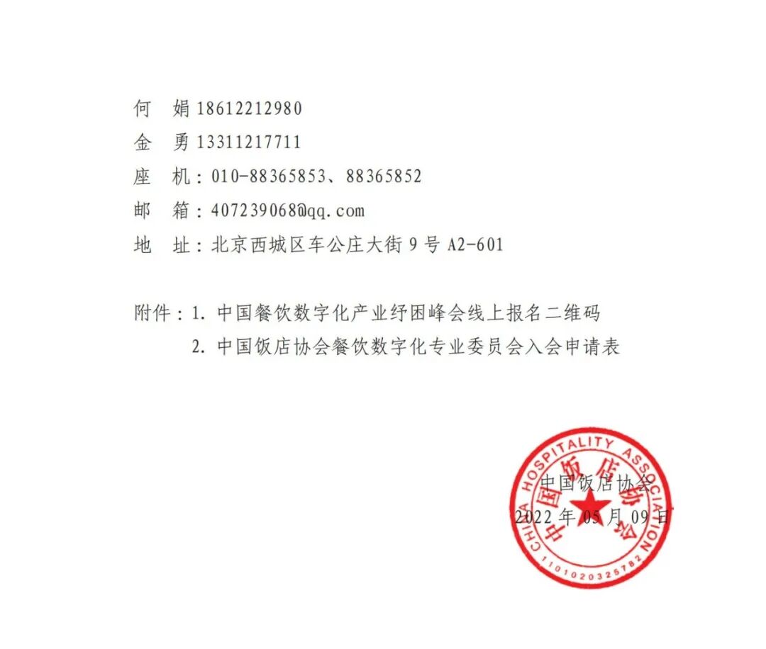 为深入贯彻党中央、国务院关于大力发展数字经济决策部署,加快餐饮业数字产业化、智能化进程,帮助连锁餐饮企业把握行业数字经济发展中新增长点,构建现代化餐饮行业数字化生态经济体系,推动餐饮业数字经济高质量发展,中国饭店协会定于2022年6月10日在线上线下举办2022中国餐饮数字化产业纾困峰会暨中国饭店协会餐饮数字化专业委员会成立大会(以下简称:数字化大会)。