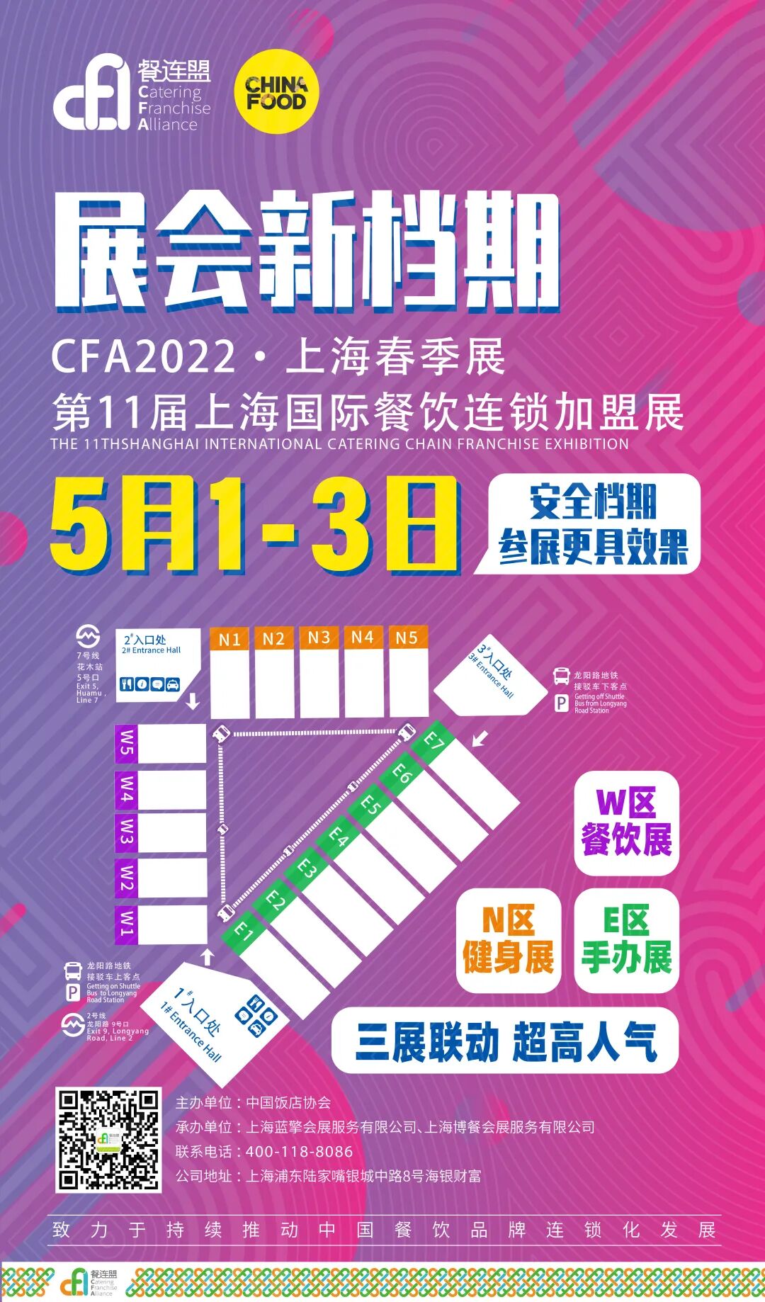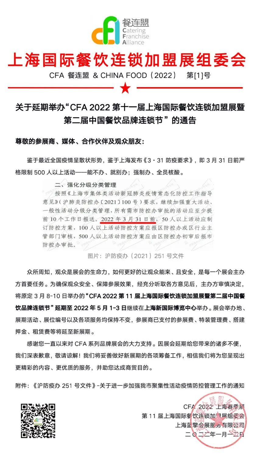 观众,作为展会生命力。经各方评估,主办方审慎决定,将原定3月8-10日举办的“CFA 2022第11届上海国际餐饮连锁加盟展暨第二届中国餐饮品牌连锁节”延至2022年5月1-3日继续在上海新国际博览中心举办。