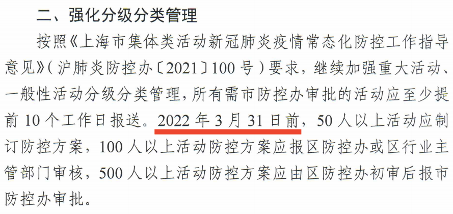 《沪防疫办251号文件》-关于进一步加强我市聚集性活动疫情防控管理工作的通知,明确要求3月31日前,超500人,即由市局报批、严格管控。而对于动辄数万人的展会,管控将严上加严。