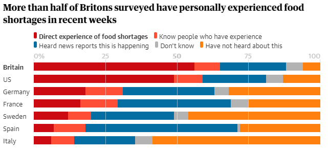 据《卫报》22日报道,一项调查显示,与法国、德国、西班牙、意大利、瑞典和丹麦相比,英国民众亲身经历或知道身边有人曾经历食物和燃料短缺的可能性要高出数倍。