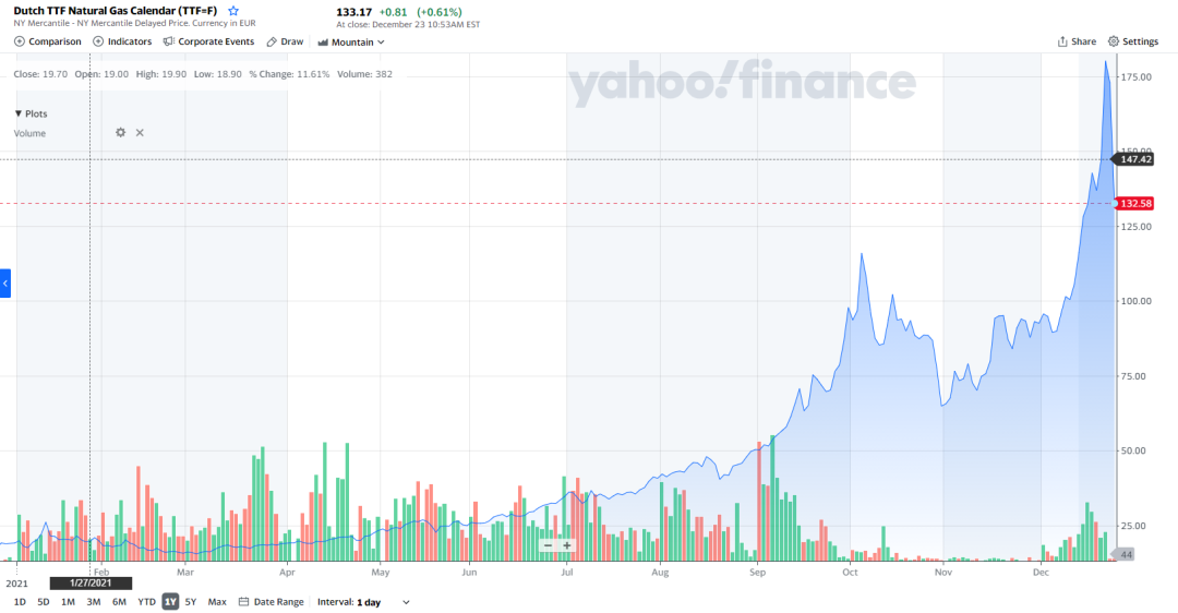 今冬能源危机席卷欧洲,天然气、电力价格飙涨,德国、乌克兰、塞尔维亚、西班牙、希腊等国都受到显著影响。欧洲天然气基准价格21日再创新高,相比今年年初涨幅达800%。后续天然气价格虽有所回落,但24日的价格与今年年初相比涨幅仍超过400%。彭博社24日的报道指出,欧洲的能源危机看不到任何缓解的迹象。