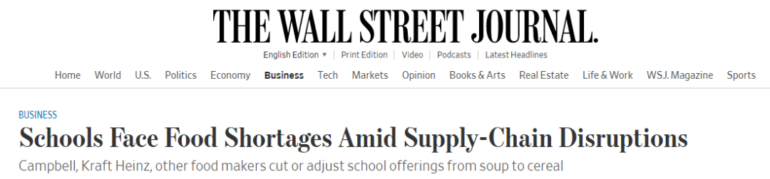△《华尔街日报》报道截图:《因供应链中断,多家学校面临食物短缺》
