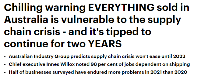 △英国《每日邮报》报道截图:《令人不寒而栗的警告:在澳大利亚销售的所有商品都容易受到供应链危机的影响——且这种情况预计会持续两年》