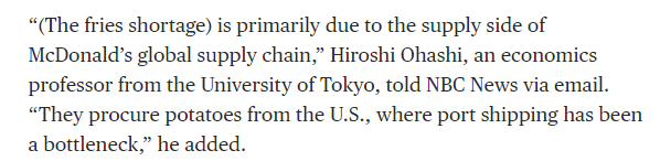 日本东京大学经济学教授大桥弘说:“(薯条短缺)主要是由于麦当劳全球供应链的供应方造成的。日本麦当劳从美国采购土豆,而美国的港口运输一直面临瓶颈。”