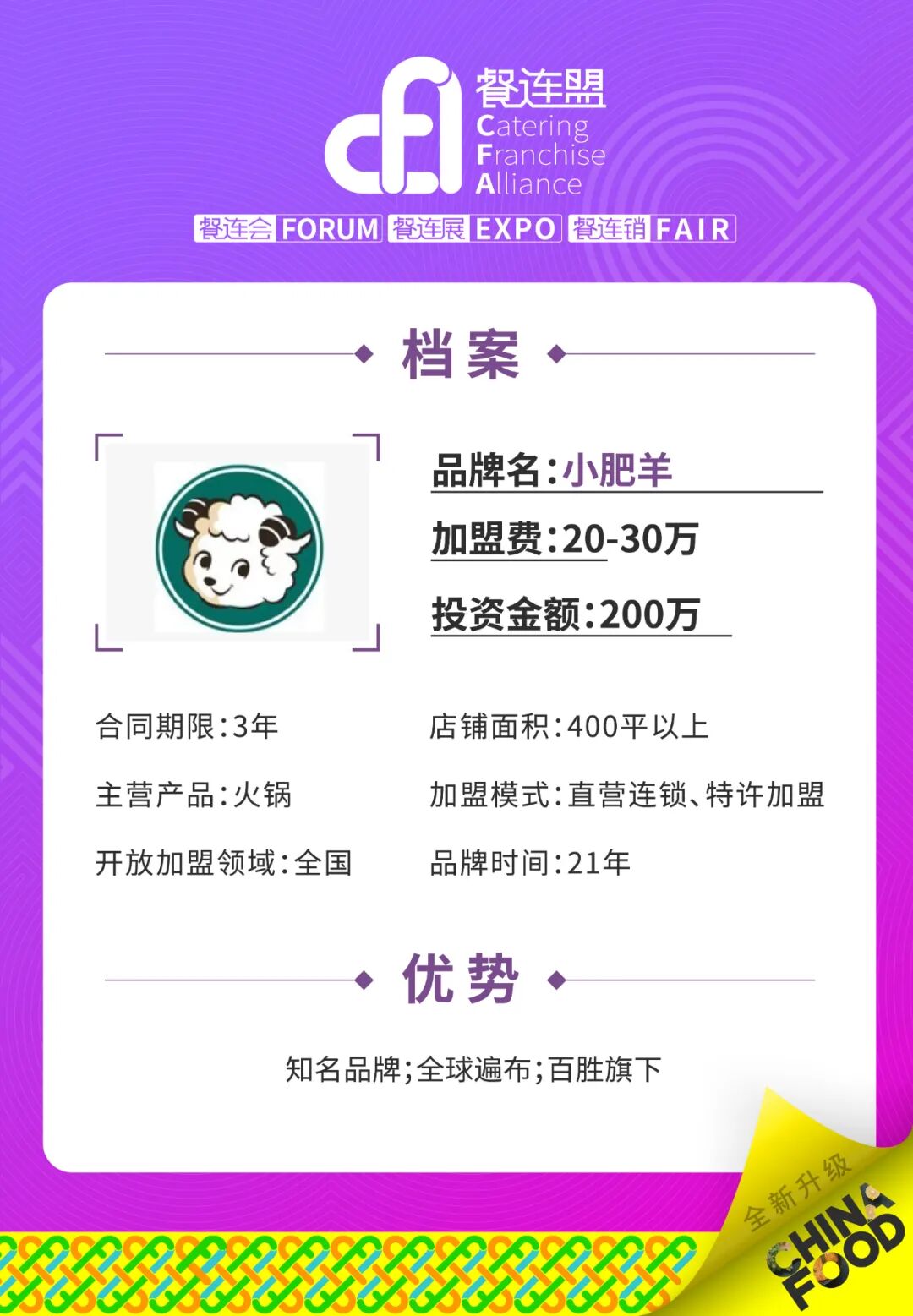 品牌简介小肥羊1999年8月创立于内蒙古包头市,目前在中国大陆、港澳地区和国际市场拥有近400家连锁餐厅,是令中国人引以为豪连锁品
