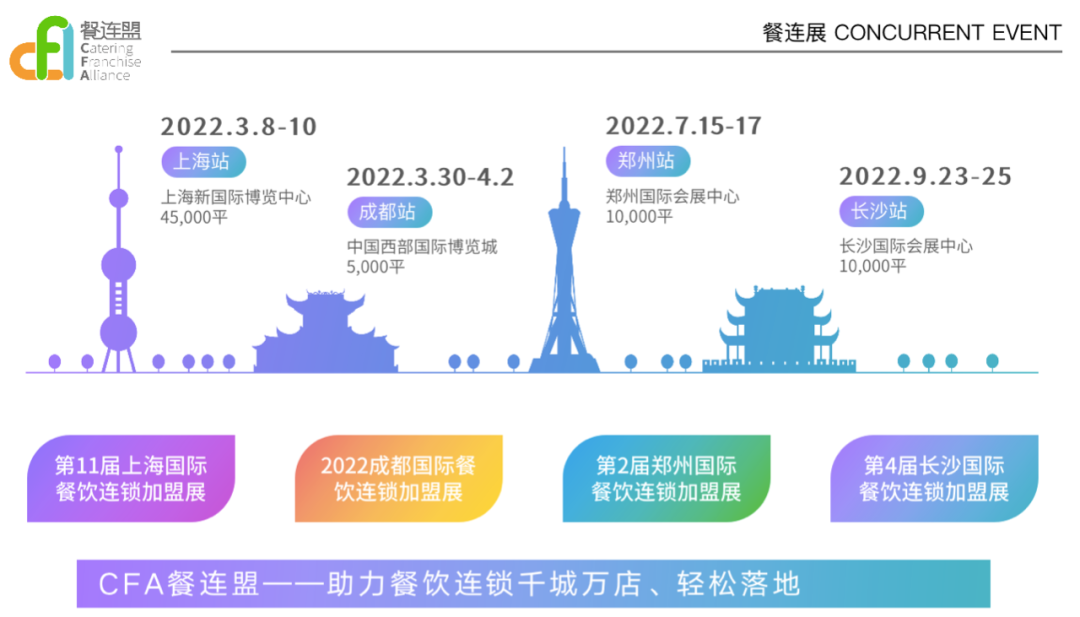 CFA餐连盟2022,立足上海,布局全国。继2018拓展长沙展、2021拓展郑州展后,2022将再次拓展第四站——成都展。助力中国餐饮连锁全国布局。
