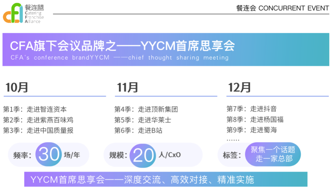 走一家总部、聚焦一个话题,身临其境展示优秀成功案例。CFA餐连盟全新为餐饮连锁品牌打造的一个全新YYCM首席思享会,集各大知名餐饮品牌、餐饮供应链、餐饮服务商于一体,只为探讨“餐饮”二字。