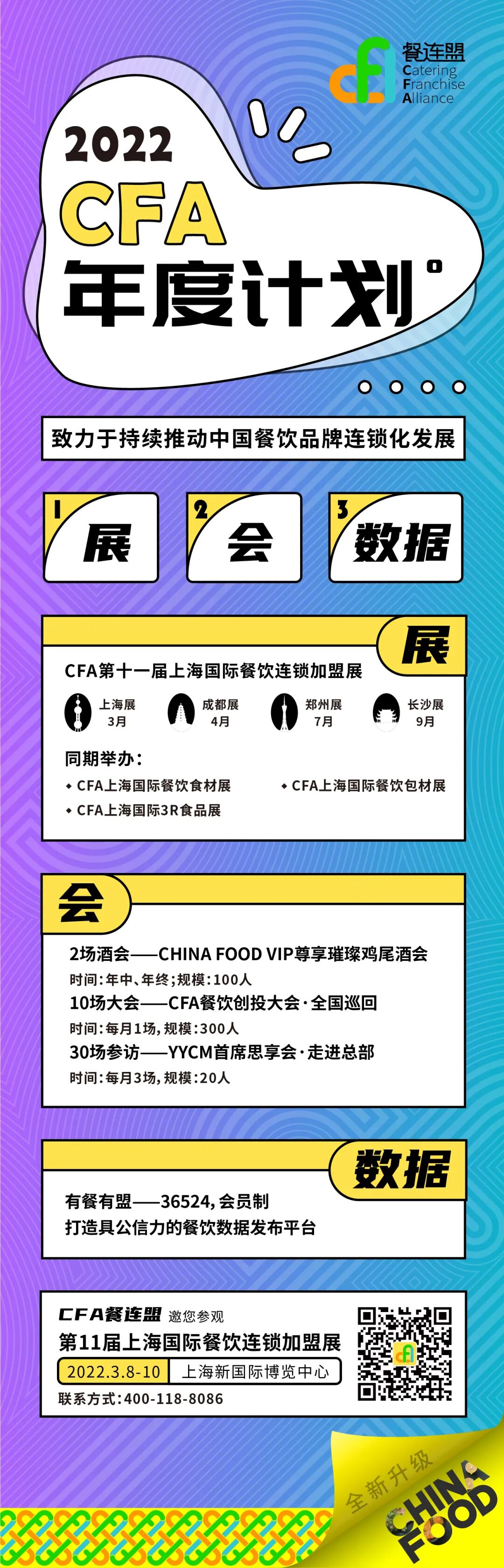 2021·CFA餐连盟CFA餐连盟2022年全年计划重磅出炉!4展、10会、30家——致力于持续推动中国餐饮品牌连锁化发展4展:上