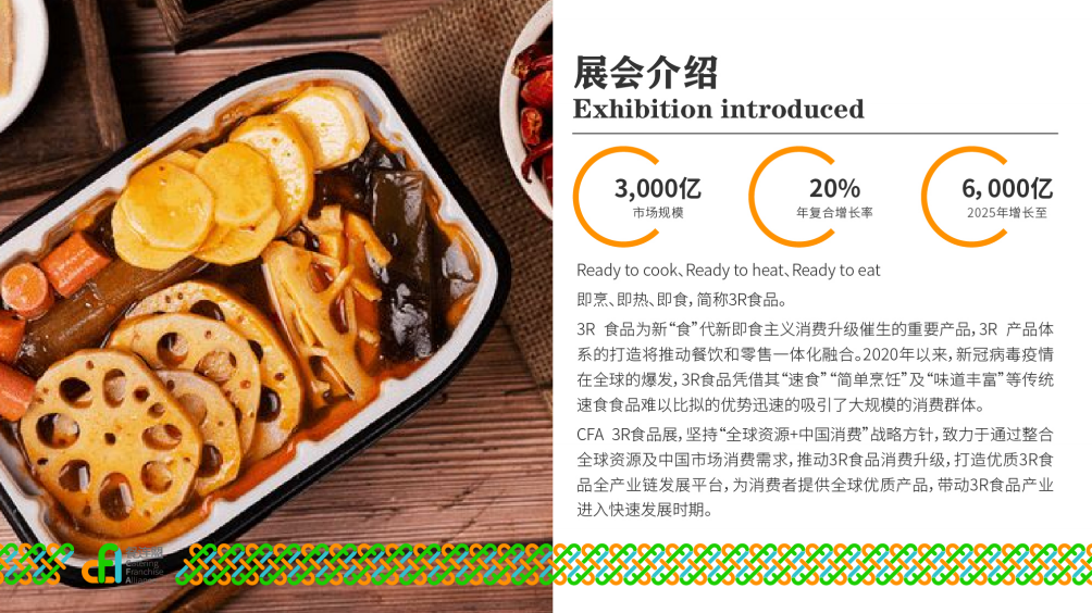 CFA2022第11届上海国际餐饮连锁加盟展,不再单单只有餐饮连锁加盟,更加入了最有话题度的“3R食品”——预制菜,让展会更多的深入餐饮,也同样使餐饮零售新赛道热闹非凡。CFA餐连盟,致力于持续推动中国餐饮品牌连锁化进程。