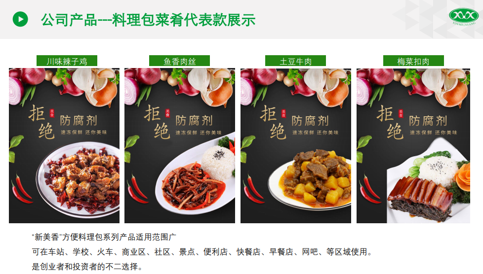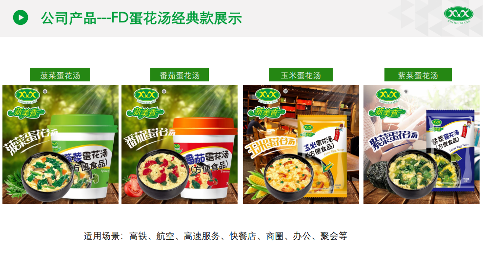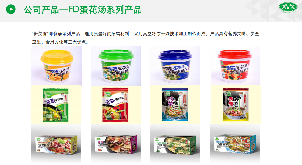 公司生产和销售“新美香”即食汤、料理包、冻干水果、脱水海鲜、肉类、蔬菜等产品。产品销往全国,远销美国、日本、韩国等国家和台湾地区。公司建有多条冻干生产线,并采用真空冷冻干燥 技术,给您新、美、香的体验。