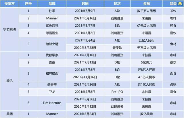 随后的2021年字节跳动持续加码,3月2日投资酒类品牌厚雪酒业、5月7日字节跳动参与了轻食品牌鲨鱼菲特近亿元人民币的B轮融资、6月16日参与咖啡品牌Manner的战略融资、7月9日字节跳动数千万人民币投资了长沙柠檬茶饮品牌柠季。