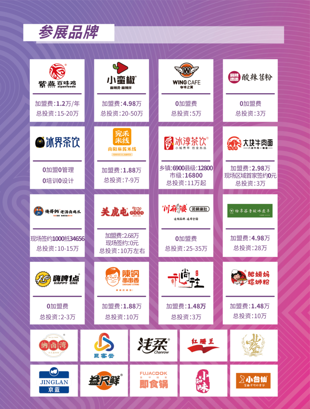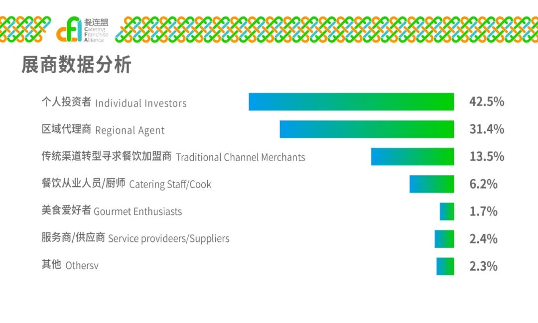 本次展会依旧是以餐饮加盟为核心,主要以代表郑州特色本地餐饮品牌为主,汇聚国内知名餐饮连锁品牌,以华中城市代表,五朝古都、中国八大古都之一的郑州,带动周边地区,CFA餐连盟以优质的服务,对接其各个品牌给每位餐饮投资人。