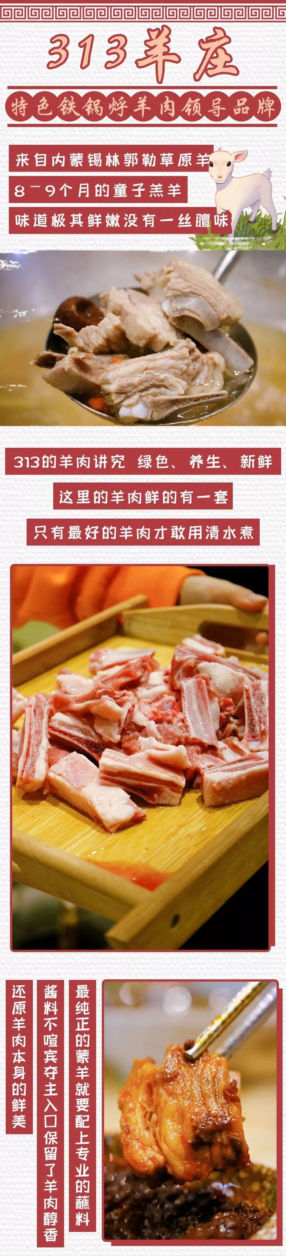 313羊庄独特的蒙古装修风格,经营原生态铁锅烀羊肉,采用鲜羊现场选、现场分割、现场清洗、现场烀肉,羊肉五种口感、羊汤十种喝发,绿色养生、鲜羊盛宴。313羊肉久煮不老、香而不腻、几乎没膻味。