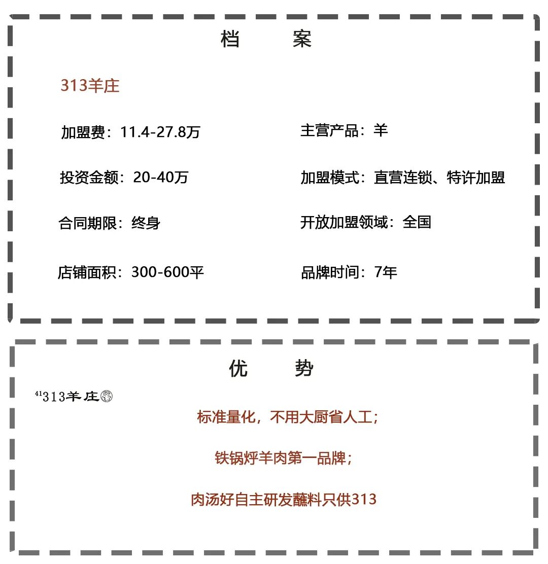 品牌简介313羊庄是全国连锁餐饮品牌店,目前全国有400多家店面,分布在黑龙江、吉林、辽宁、河北、河南、山东、山西、陕西、浙江、江