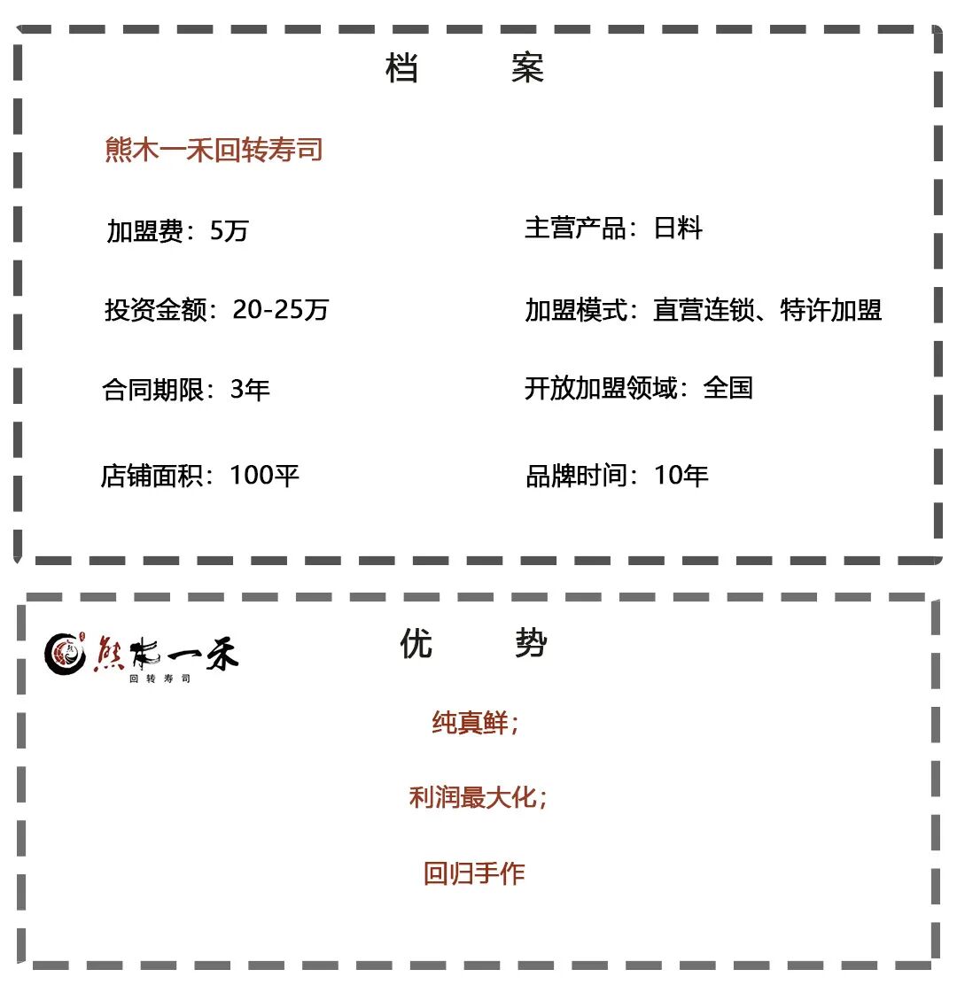 品牌介绍熊木一禾不同于国内其他的日本料理店,是自创的品牌。熊木一禾始终坚持"安全、时尚、美味、健康!""为喜爱熊木一禾的朋友营造一
