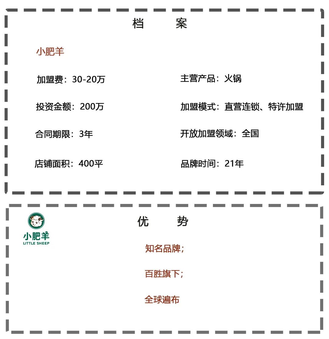 品牌介绍小肥羊1999年8月创立于内蒙古包头市,目前在中国大陆、港澳地区和国际市场拥有近400家连锁餐厅,是令中国人引以为豪连锁品