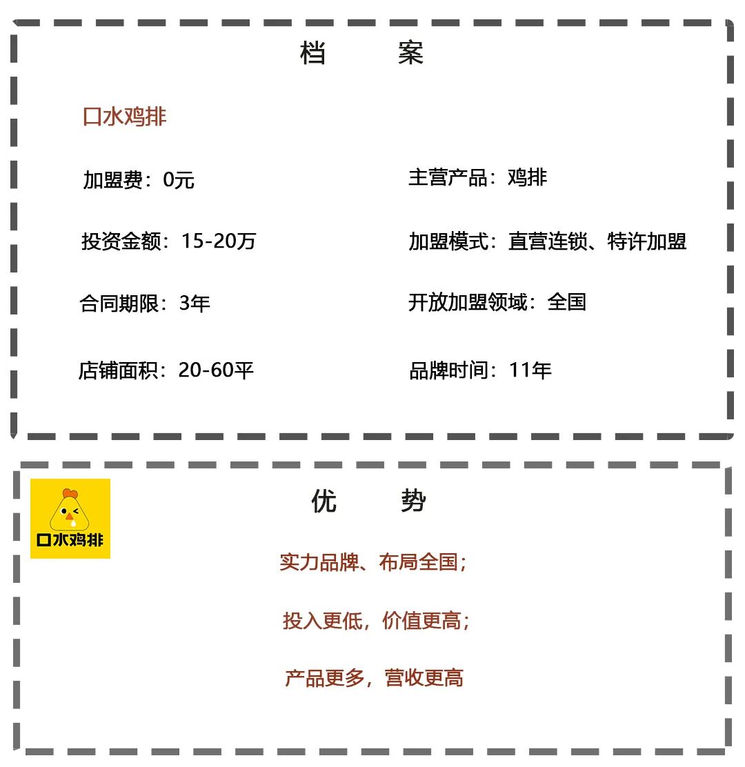口水鸡排拥有成熟的市场运营和管理经验,已形成以市场调研、产品研发、技术传输、冷链物流、连锁经营、品牌运作、店面管理为一体的专业运营体系,全国门店千余家,每天服务顾客超过 50 万人。未来还将稳扎稳打,做鸡排行业内的龙头品牌!