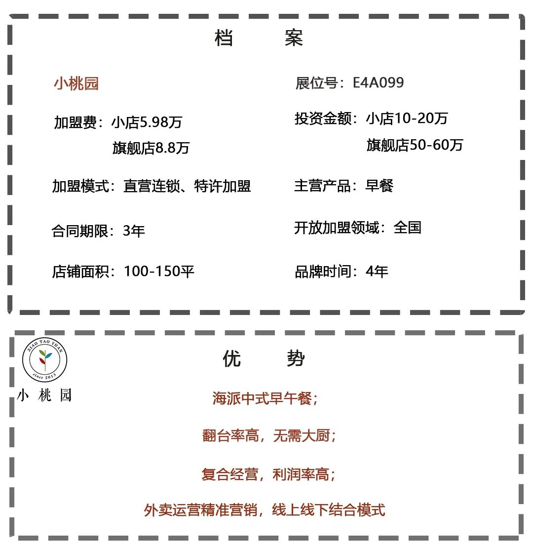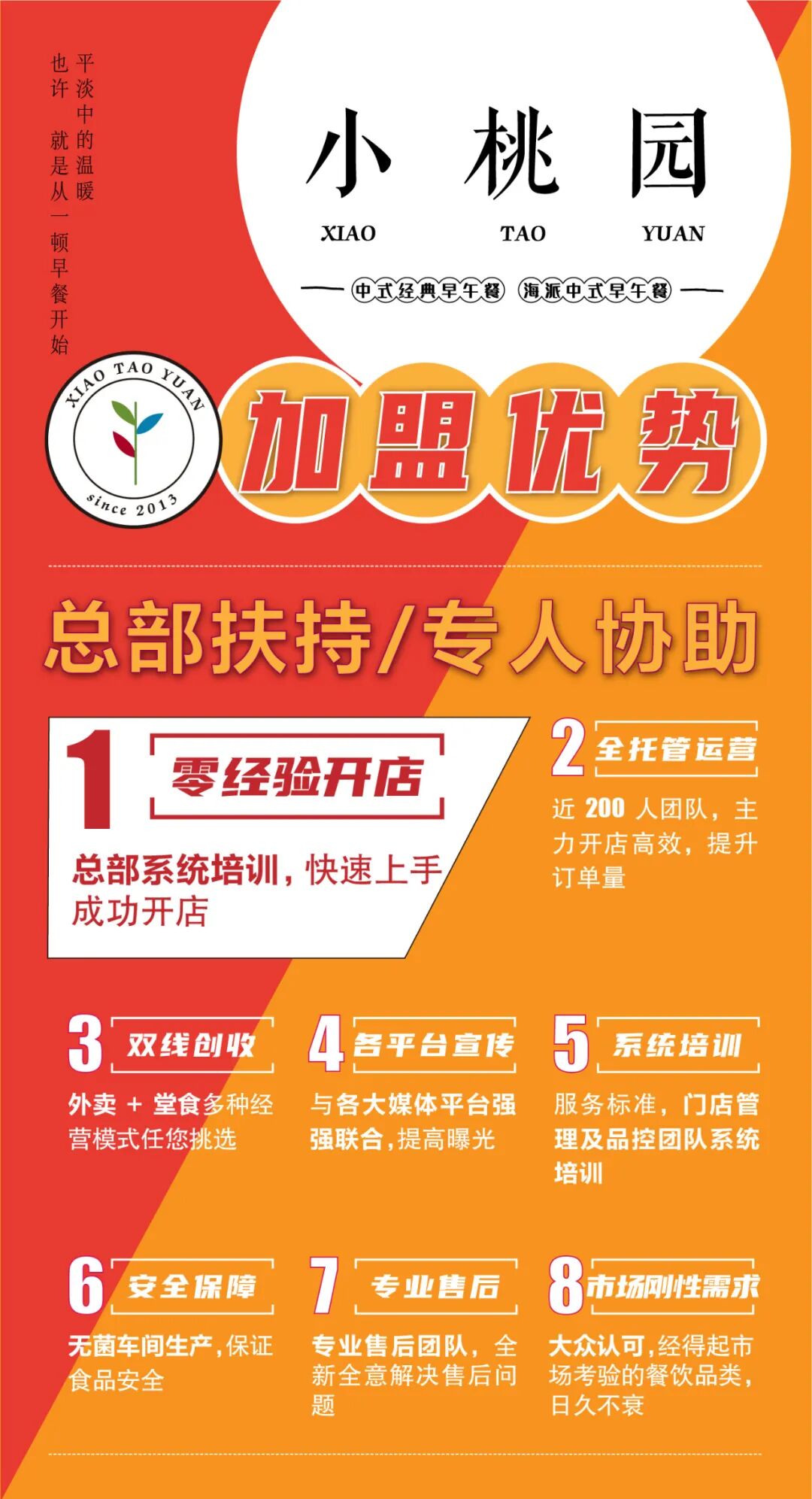 品牌简介小桃园餐饮文化为东方文化及西方文化的交汇所在发展出一套融合中国点心(主要为烧饼、油条、糍饭和豆浆)24小时营业。创始人李强