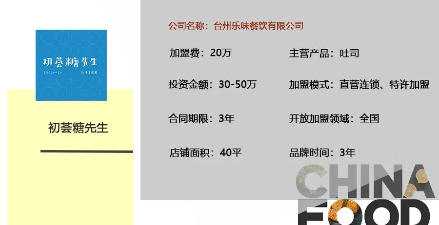 品牌简介 初荟糖先生创建于2017年,专营日式手工吐司,是台州乐味餐饮有限公司旗下连锁品牌。纯手工制作,拒绝冷冻面团与中央厨房,在
