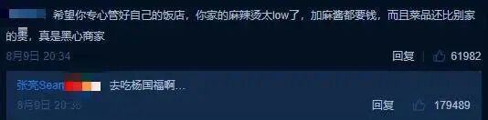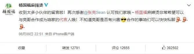 8/9日下午,张亮发微博分享了自己录制综艺节目《中餐厅4》的心得感受,并且帮助节目中的合作嘉宾赵丽颖澄清“被质疑没有餐桌礼仪”一事。但评论区却有一位网友吐槽张亮麻辣烫是“黑心商家”,让他“本人”专心管好自己的饭店。张亮回复道:“去吃杨国福啊…”,随后@杨国福麻辣烫反应迅速,立刻隔空喊话,向张亮抛出橄榄枝,发微博称:“感谢认可,非常希望与亮哥合作。”