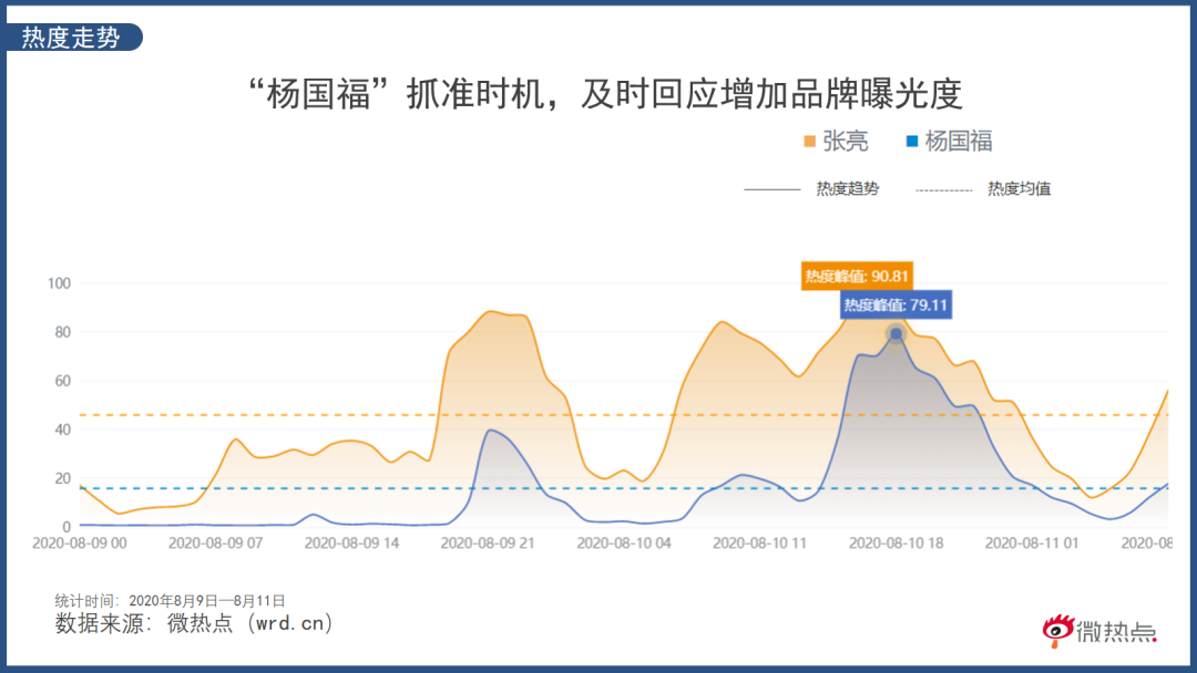 根据微热点(wrd.cn)数据统计显示,8/9日,杨国福麻辣烫作出回应后,“张亮”与“杨国福”的热度迅速上升,随后二者的热度在10日达到峰值,且走势趋于相同,由此可见,张亮的评论出圈在一定程度上对杨国福的热度提供了正面作用。而杨国福得以登上热搜,不仅仅是靠张亮的回复推波助澜,更是因为及时的回应和后续多条微博的持续营销从而增加了品牌的曝光度。