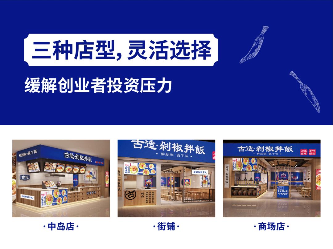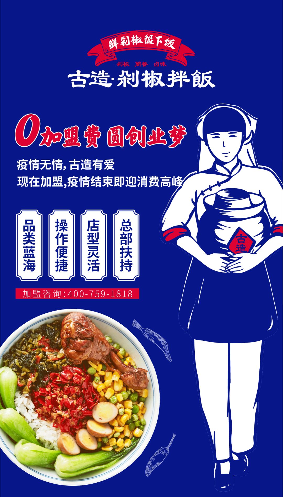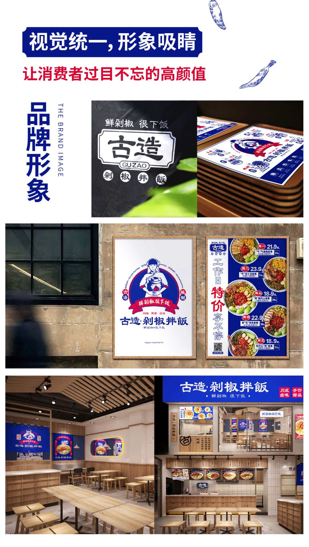 古造•剁椒拌饭品牌:【古造•剁椒拌饭】1、基本投资额(堂食店):25-30万元2、店铺面积要求:35-75m²3、预估客单价:25