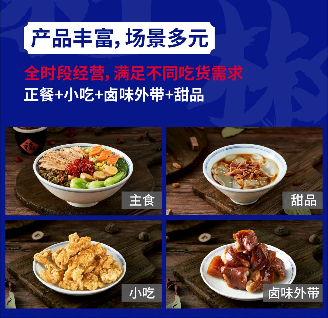 分四大产品线,正餐+小吃+甜品+卤味外带,匹配不同消费场景,满足全天候经营需求。