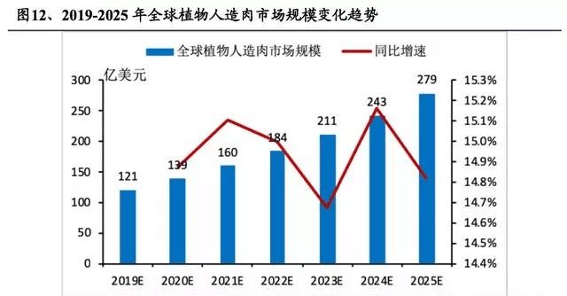 九月份,中国植物性食品产业联盟在北京举办了“中国人造肉行业发展及政策研究座谈会”,会上业内专家预计,全球人造肉的市场规模将在今年达到120亿美元,约合人民币855亿人民币。2025年市场规模将达到280亿美元,约合2000亿人民币。