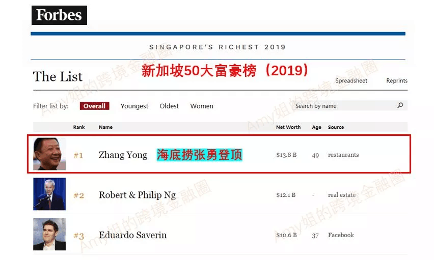 8月30日,福布斯亚洲发布了《新加坡50大富豪榜(2019)》,海底捞老板张勇 以138亿美元(折合约1000亿RMB)身家登上榜首。