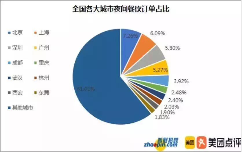 调研显示,68.2%的白领夜间消费集中在餐饮方面。全国各大城市夜间餐饮订单排名中,北京、上海、深圳、广州、成都、重庆、武汉、杭州、西安以及东莞等10个城市,就占到全国近四成(38.99%)。