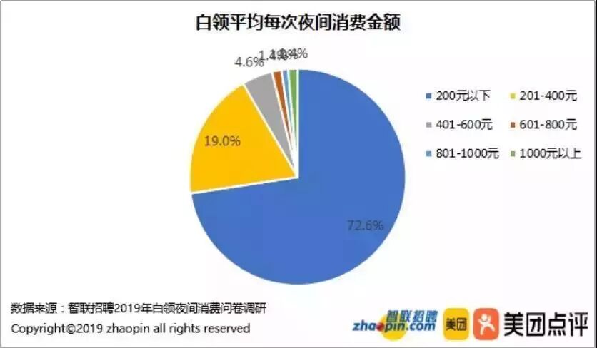 调研显示,72.6%的白领夜间消费金额的平均值低于200元,19%的白领的夜间消费金额平均值在201~400元之间,夜间消费金额在千元以上的仅占1.4%。