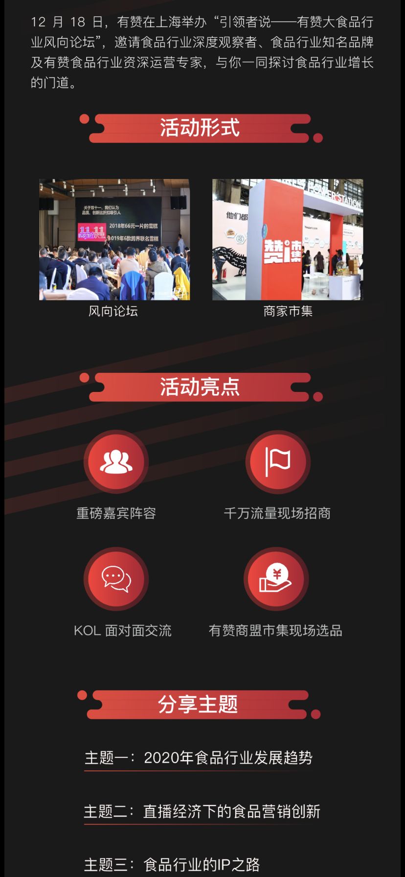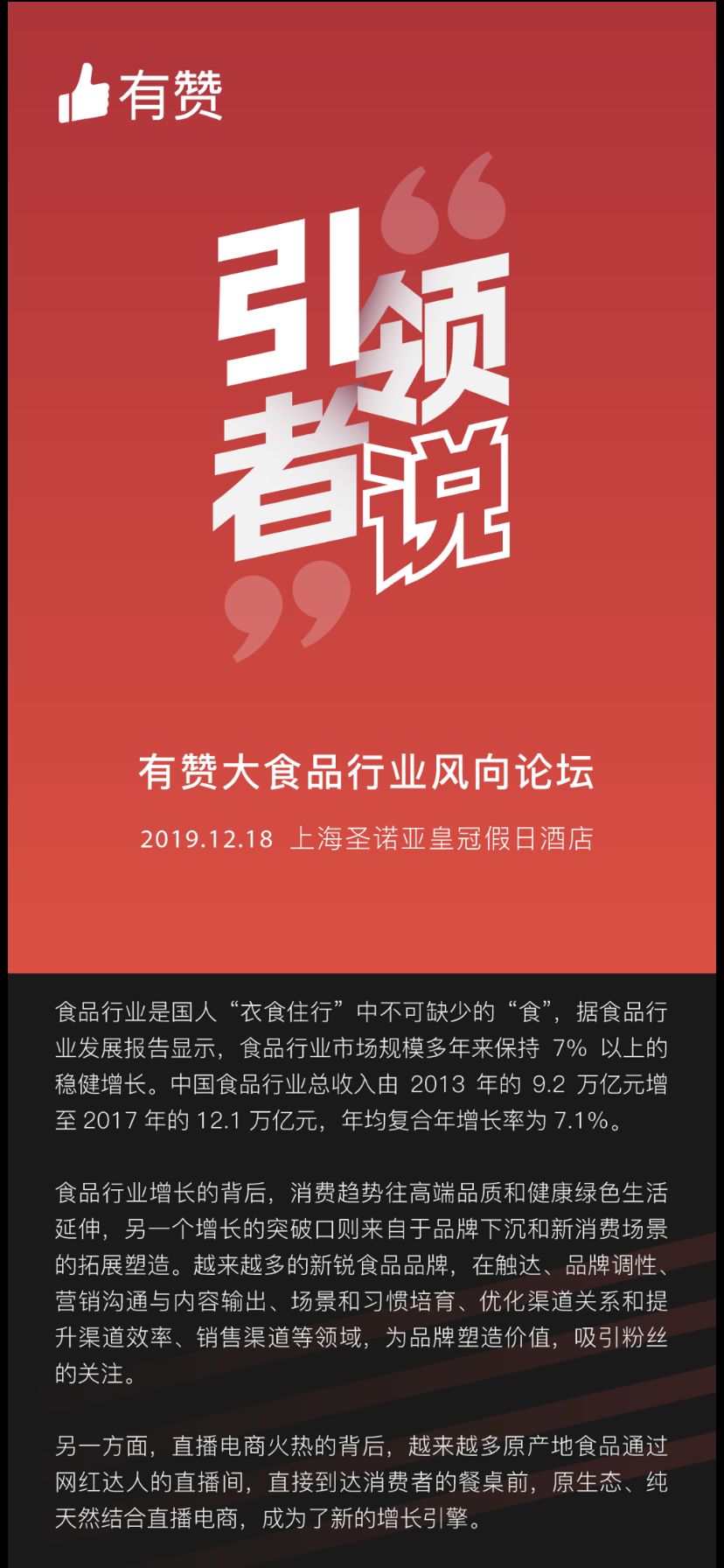 12月18日,有赞将在上海举办“引领者说——有赞大食品行业风向论坛”,邀请食品行业深度观察者、食品行业知名品牌及有赞食品行业资深运营专家,与你一同探讨食品行业增长的门道。