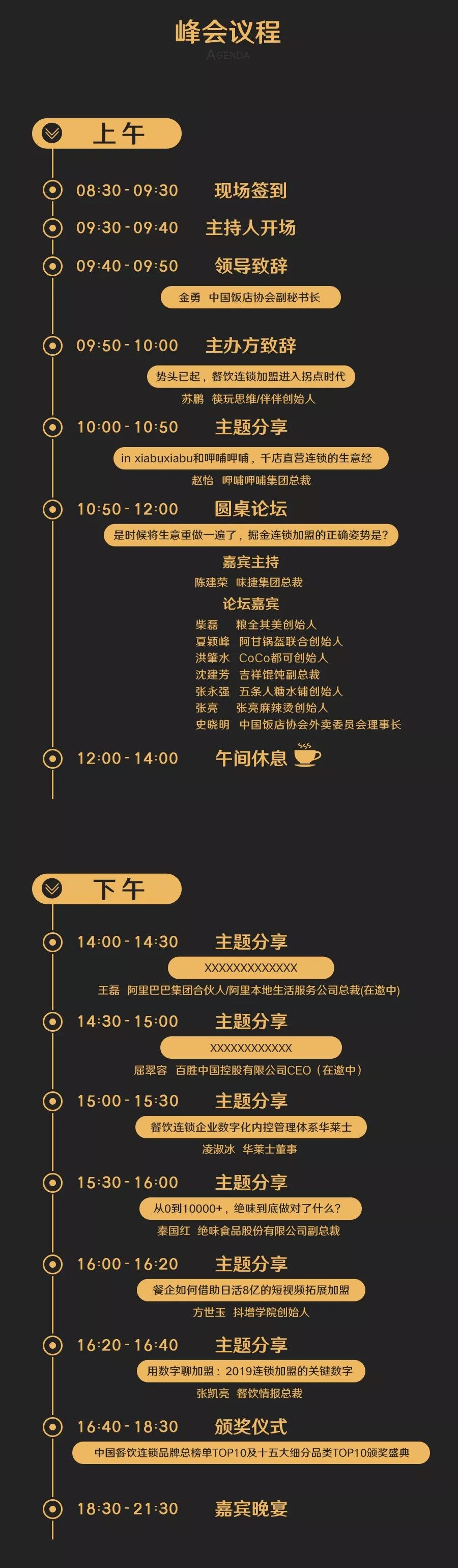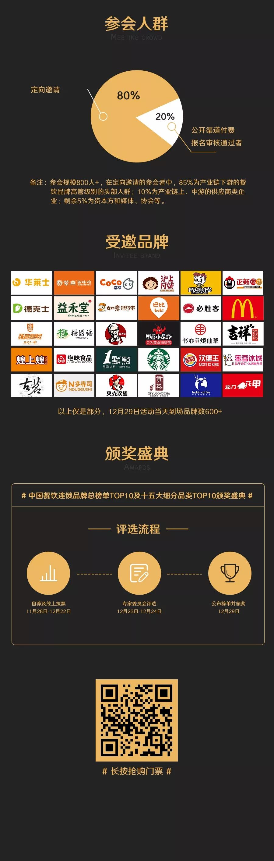 1)、真正的大咖云集:呷哺呷哺(连锁火锅第一股/港交所上市企业)、华莱士(本土最大的餐饮连锁巨头之一,最新门店数已突破12000家)、绝味鸭脖(11000多家门店)、张亮麻辣烫(5000多家门店)、吉祥馄饨(3000多家门店)、阿甘锅盔(1200多家门店)等品牌创始人及高管悉数出席峰会进行重磅分享,百胜中国、天图资本、华与华等大咖也在力邀中。2)、峰会整体参会人数规模800+,其中85%为定向邀请的连锁型餐饮品牌负责人,到场的连锁餐饮品牌负责人不低于600+。3)、本届峰会将隆重公布和颁发中国餐饮连锁品牌总榜单TOP10及十五大细分品类最具影响力榜单TOP10,近200余奖项将在峰会现场重磅揭晓。具体奖项为:中国最具影响力餐饮连锁品牌TOP10、中国餐饮连锁最受欢迎服务商品牌TOP10以及“火锅/烧烤/茶饮/小龙虾/小吃/熟食卤味/粥/烘焙甜点/面食/炒饭/便当/麻辣烫/炸鸡/汉堡/沙拉轻食”十五大餐饮细分品类最具影响力品牌TOP10。
