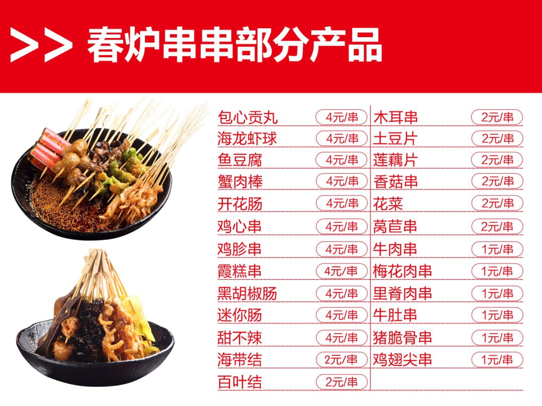 春炉串串的门店虽然不大,但是店内的SKU却高达20多种,可以极大程度满足消费者对于串串的消费需求。而在大店里,春炉串串甚至可以做到50-80中SKU,基本囊括市场上常见的串串产品。