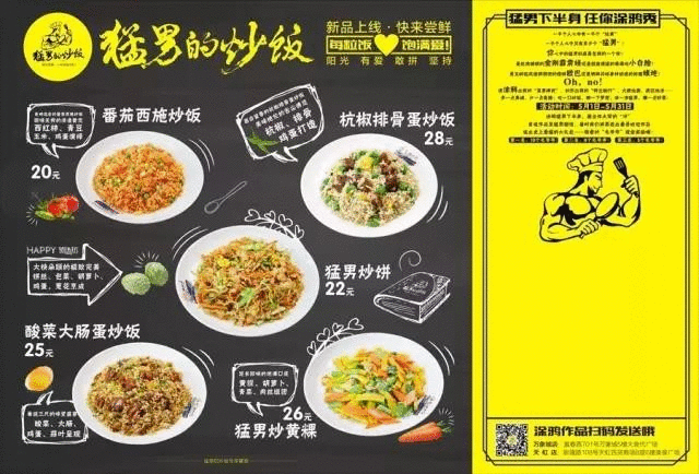 中国是个美食大国,餐饮品类众多,“炒饭”这个小品类先天优势不强,持续“黏住”消费者不简单,为此,品牌需要不断升级变化,刺激消费者—— 为此,猛男的炒饭今年升级出了“3.0 版”。一直强调“有爱”的猛男,在这次迭代中,变得越来越“猛”—— 门店处处可见篮球框、杠铃、吊环灯、跑道划线等场景化设计,均突出了“猛”的力量元素。