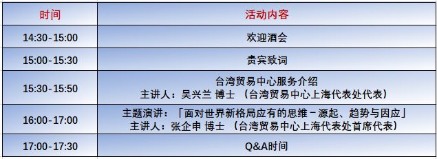 在说明会的主题演讲环节,我们邀请到台湾贸易中心上海代表处首席代表张企申博士,他将为我们带来题为「面对世界新格局应有的思维-源起、趋势与因应」的演讲,演讲中 “面对全球贸易保护主义,我们该如何因应” 的主题,是当下许多大中小企业家们思考的议题,也是我们如何冲破贸易封锁,因应大环境的挑战,找到企业当下生存的重要课题。
