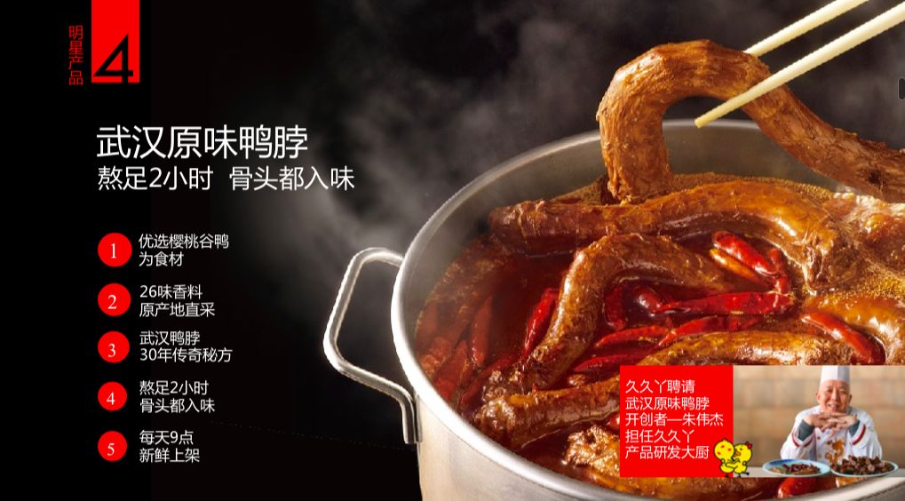 久久丫聘请了原武汉精武路上非常出名的大厨朱伟杰,来主导久久丫武汉原味的研发,朱伟杰师傅早在30年前就主导了武汉精武路上卤味小吃的新品类,不断研发创新,浸润数十年,经统计朱师傅亲手卤制的鸭脖就超过了200万根,香料更是难以计数,无数个沉迷于研发的日夜,终于研发出了让人赞不绝口的武汉原味鸭脖。