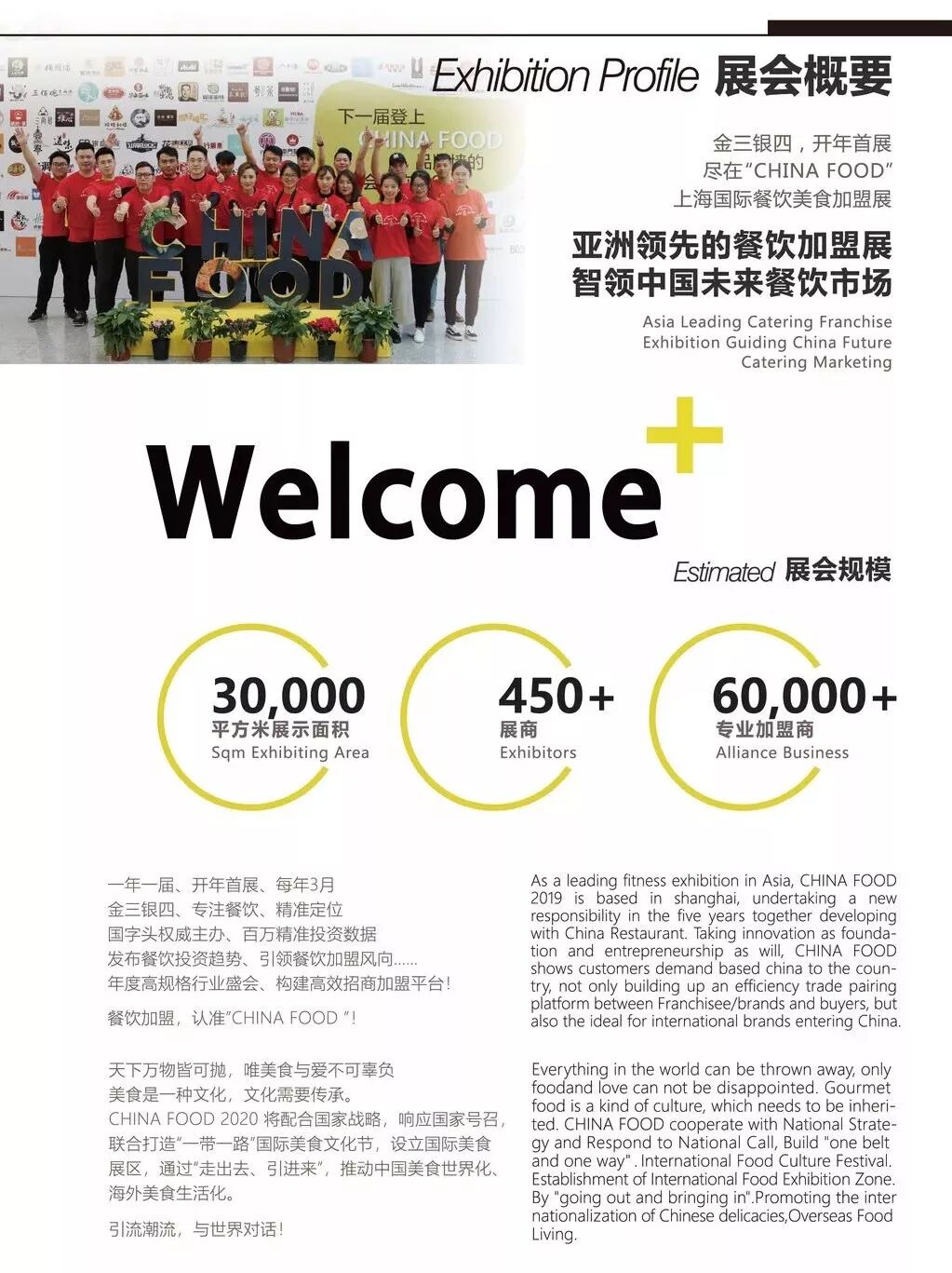 据悉,CHINA FOOD 2020第七届上海国际餐饮美食加盟展整体规模将进一步扩大:展馆面积将增至30,000平方米!参展品牌预计突破450+!60000+到场专业加盟商!