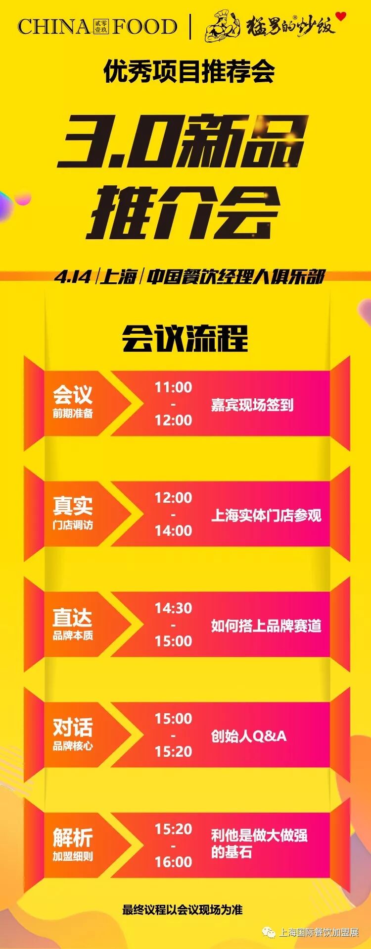 有颜值、好运营的“猛男”与CHINA FOOD合作已久。4月14日,CHINA FOOD上海国际餐饮美食加盟展——优秀项目推荐会上,猛男的炒饭将携品牌3.0正式与大家见面。