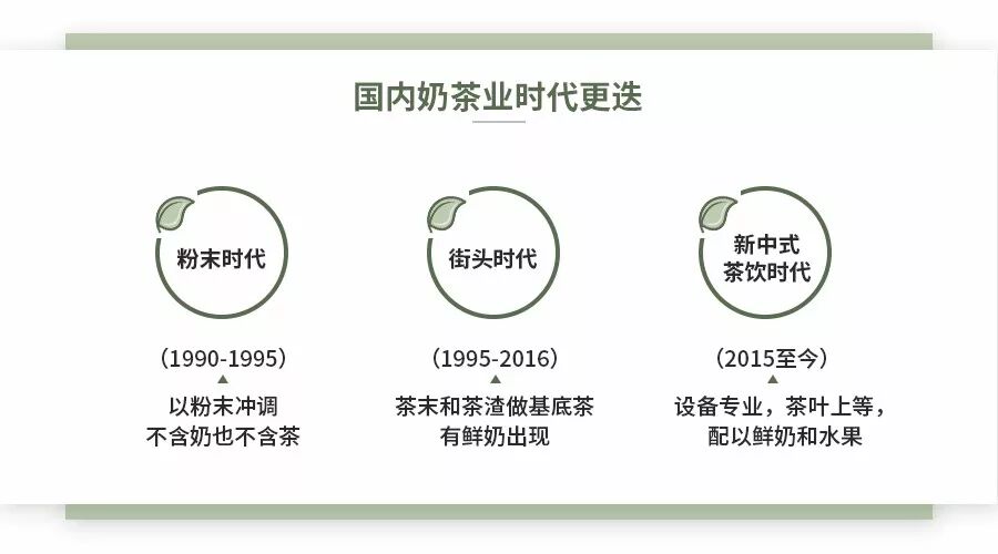奶茶分为三个时代,1990—1995年是奶茶第一个时期,被称为“粉末时代”,国内的奶茶以粉末冲调,一杯奶茶不含奶也不含茶。从21世纪初开始,奶茶进入了街头时代,在制作中开始选择茶基底,但普遍选择的是茶末和茶渣,直到2015年左右,部分品牌才开始选择上等茶叶及水果制作茶饮。