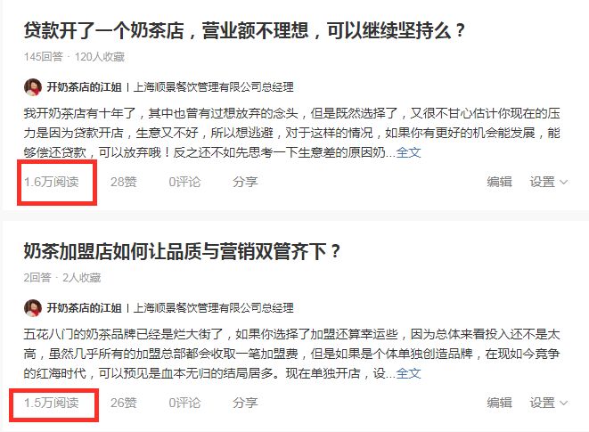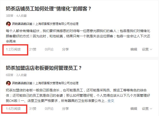 江姐,还在今日头条,通过文章、视频、问答等方式,给其他奶茶店老板答疑解惑,收获粉丝7000+,累计阅读10万+。同时,还在千聊上做线上讲课。